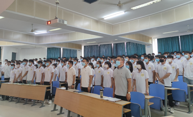 新生开学见面会在庄严的国歌声中拉开序幕。