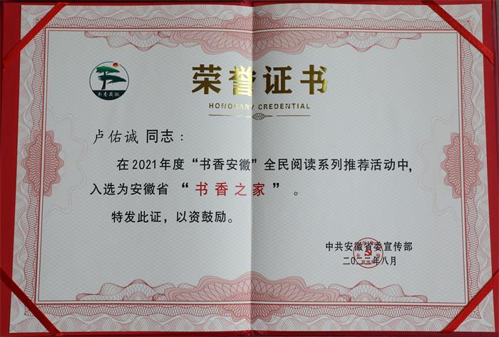 为发挥典型引领示范作用,省委宣传部组织开展了2021年“书香安徽”全民阅读系列推荐活动。近日省委宣传部公布了“书香之家”入选名单,我校卢佑诚教授荣获2021年度安徽省“书香之家”荣誉称号。